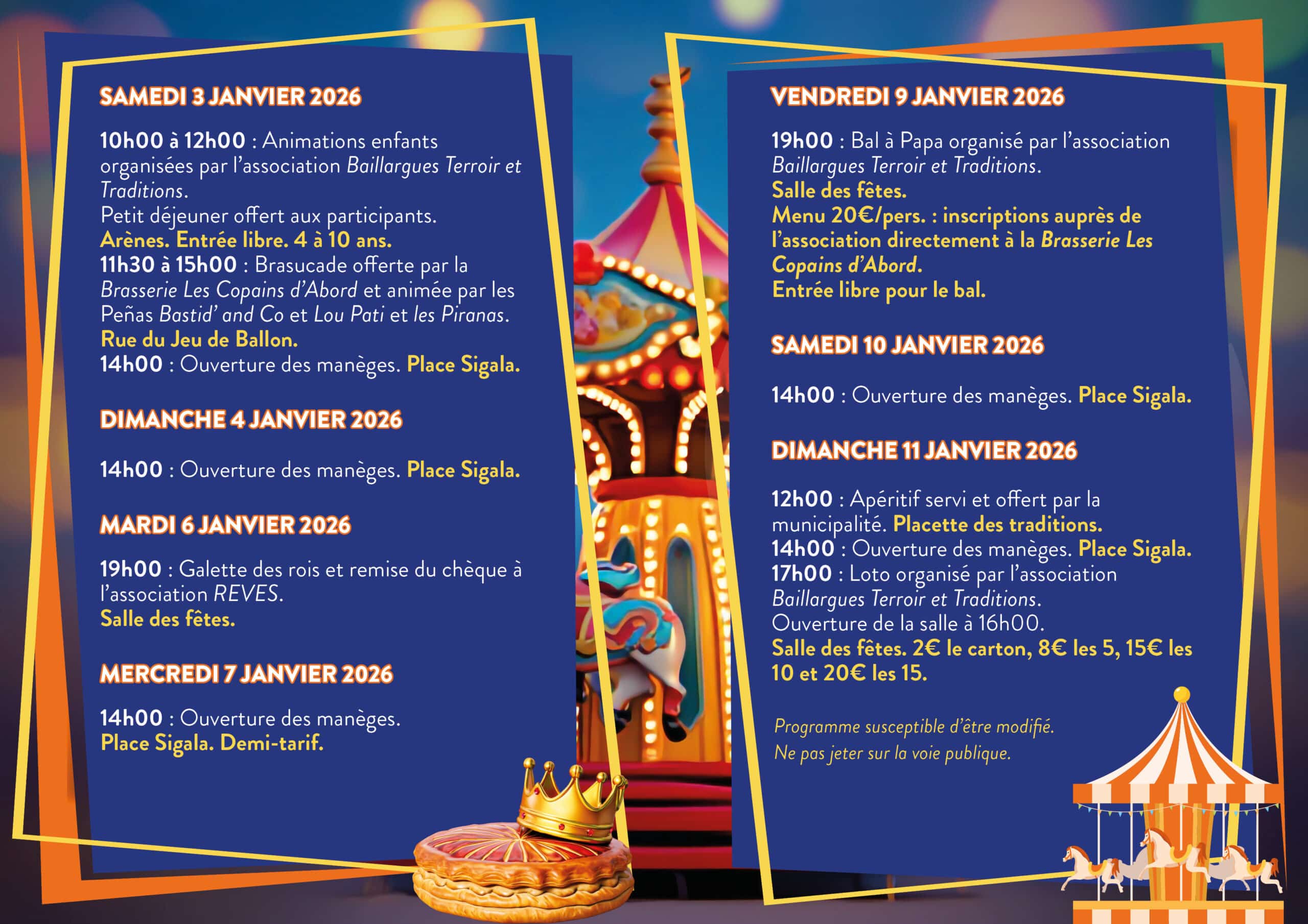 • Loto et apéritif avec les élus : Le dimanche 11 janvier, profitez d’une journée festive, avec un apéritif servi par les élus et un loto pour petits et grands à la salle des Fêtes par l’association Baillargues, Terroir et Traditions.